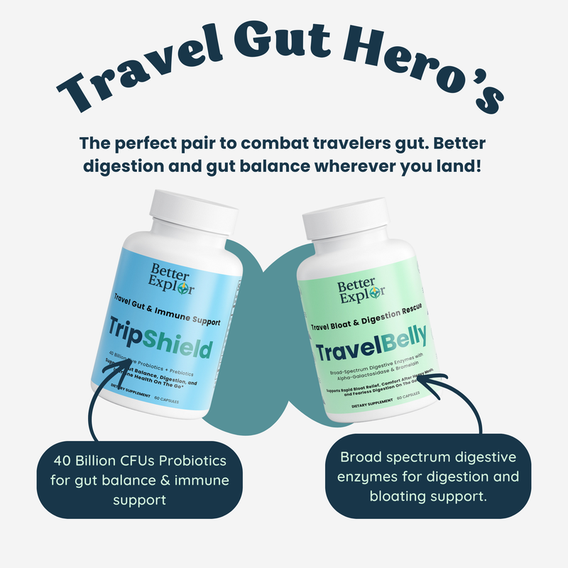 Travel Gut Heroes combines two complementary formulas — digestive enzymes and high-potency probiotics — to support digestion, gut balance, and comfort when travel disrupts your normal routine.